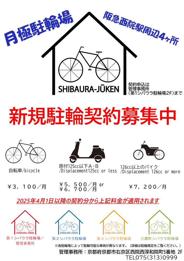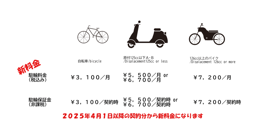 さて、この度昨今の物価上昇や維持管理費用の増加に伴い、2025年4月1日よりシバウラ駐輪場の料金を下記の通り改定させていただきます。今後も皆様に安全で快適な駐輪環境をご提供するために、引き続き努力してまいりますので、何卒ご理解とご協力を賜りますようお願い申し上げます。